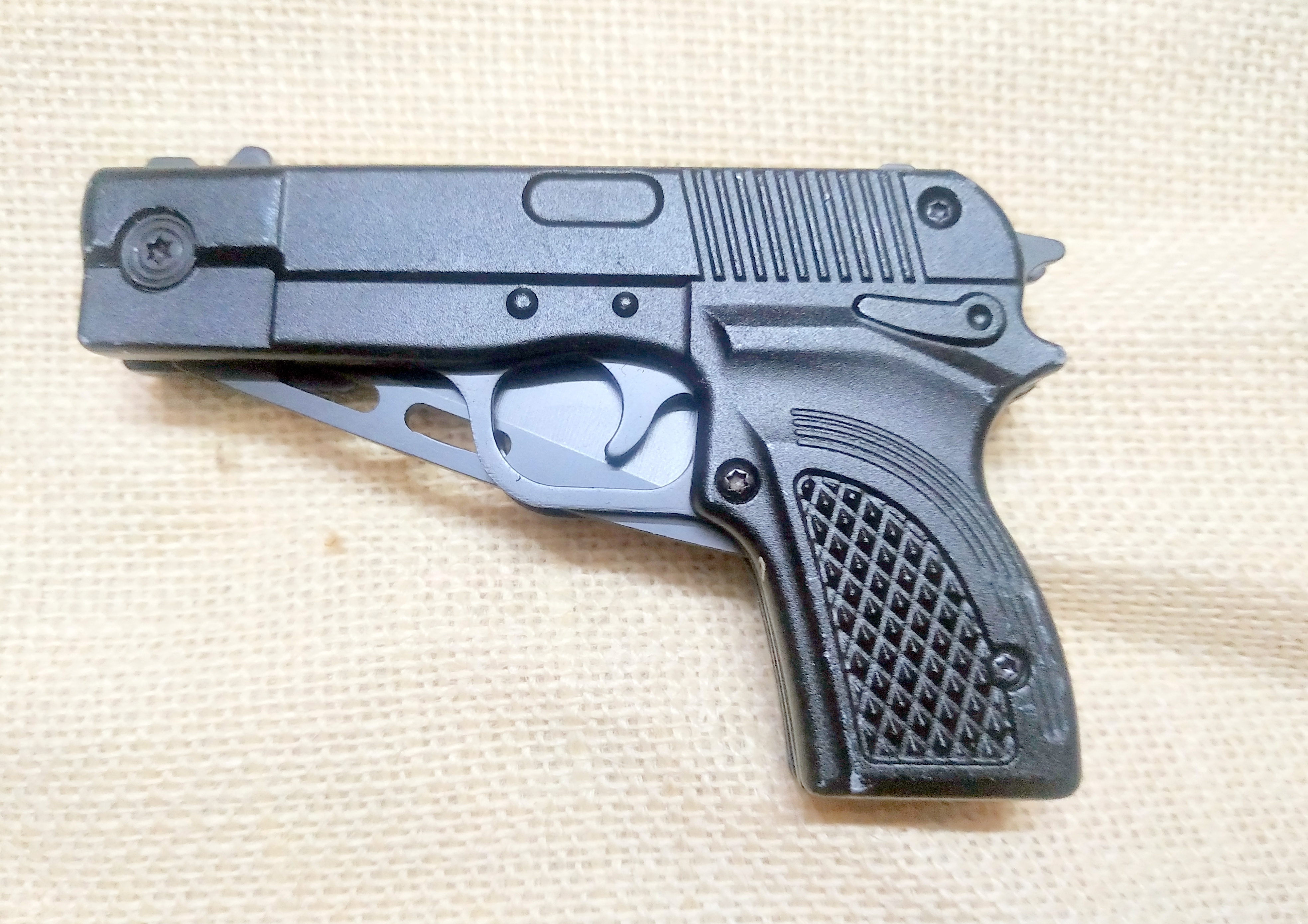 Appearing to be nothing more than a conventional handgun, a quick flick of the true trigger reveals this handy little beauty inner secret- its actually a knife with a 3 inch drop point blade. Razor sharp, the blade has a powder coated black finish and is made from high quality stainless steel. The black finish molded mounts provides for a solid grip that feels good in the hand. While you should never bring a knife to a gun fight, this is one gun that wont be out of place at all at a knife fight!